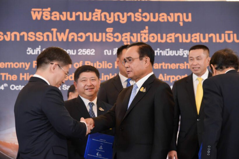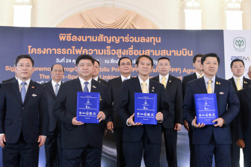 เมื่อวันที่ 24 ตุลาคม 62 เวลา 13.30 น. ณ ตึกสันติไมตรี (หลังใน) ทำเนียบรัฐบาล พลเอก ประยุทธ์ จันทร์โอชา นายกรัฐมนตรีและรัฐมนตรีว่าการกระทรวงกลาโหม เป็นประธานในพิธีลงนามสัญญาร่วมทุนโครงการรถไฟความเร็วสูงเชื่อมสามสนามบิน พร้อมเป็นประธานพิธีลงนามบันทึกความเข้าใจเพื่อสนับสนุนโครงการฯ รถไฟความเร็วสูงเชื่อมสามสนามบิน โดยมี นายอนุทิน ชาญวีรกูล รองนายกรัฐมนตรีและรัฐมนตรีว่าการกระทรวงสาธารณสุข พลเอก อนุพงษ์ เผ่าจินดา รัฐมนตรีว่าการกระทรวงมหาดไทย นายศักดิ์สยาม ชิดชอบ รัฐมนตรีว่าการกระทรวงคมนาคม เอกอัครราชทูตสาธารณรัฐประชาชนจีนประจำประเทศไทย เอกอัครราชทูตญี่ปุ่นประจำประเทศไทย เอกอัครราชทูตสาธารณรัฐอิตาลีประจำประเทศไทย และแขกผู้มีเกียรติ เข้าร่วมเป็นสักขีพยาน ซึ่งมีนายคณิศ แสงสุพรรณ เลขาธิการคณะกรรมการนโยบายเขตพัฒนาพิเศษภาคตะวันออก กล่าวรายงานความเป็นมาของโครงการ