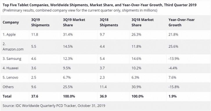 ต้องยอมรับในช่วงปีที่ผ่านมา ตลาดแท็ปเล็ตโลกมีสัญญาณการเจริญเติบโตไปในทิศทางที่ค่อนข้างดี. โดยรายงานล่าสุดจอดองค์กรจัดสรรข้อมูล Internation Data Corporation หรือ IDC ได้มีการเปิดเผยข้อมูลสถิติยอดขายและการเจริญเติบโตในช่วงไตรมาสที่ 3 ปี 2019 ของ 5 ผู้นำในอุตสหกรรมแท็ปเล็ตโลกที่โดยรวมมีการเจริญเติบโตขึ้ถึง 1.9%. ซึ่ง 5 ผู้ทำในอุสาหกรรมแท็ปเล็ตโลกในตอนนี้ก็ได้แก่ 1. Apple, 2. Amazon, 3. Samsung, 4.Huawei และ 5. Lenovo.