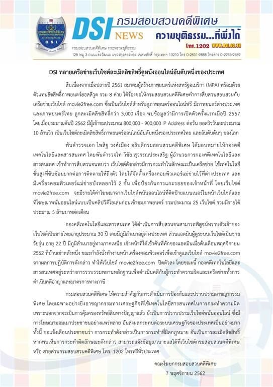DSI ทะลาย ‘Movie2Free’ ปิดตำนานเว็บละเมิดลิขสิทธิ์หนังอันดับ 1 ของไทย