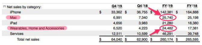 ล่าสุดมีการเปิดเผยรายงานตัวเลขผลประกอบการในไตรมาสล่าสุด ซึ่งสินค้าประเภทเครื่องประดับไอที ทำรายได้ตีตื้นขึ้นมาเกือบจะเทียบเท่ารายได้จากคอมพิวเตอร์ Mac. ซึ่งหากเทียบกับไตรมาสเดียวกันในปีที่แล้วนั้นจะเห็นได้ว่าตัวเลขยังค่อนข้างห่างกันอยู่พอสมควร. ซึ่งเหมาะเจาะพอดีกับช่วงเวลาที่ยอดขาย iPhone อยู่ในขาลงและทำได้ไม่ค่อยดีนักเมื่อเทียบกับไตรมาสเดียวกันในปีที่แล้ว. ในปีงบประมาณ 2019 สินค้าประเภทเครื่องประดับไอทีของ Apple ทำรายได้ไปกว่า $24.5 พันล้านเหรียญฯ คิดเป็น 95% ของรายได้จากสินค้าประเภทคอมพิวเตอร์ Mac ซึ่งเป็นตัวเลขที่สูงมากเมื่อเทียบกับช่วงปีที่ผ่านที่ทำรายได้คิดเป็นแค่ 69% จากรายได้จากคอมพิวเตอร์ Mac.
