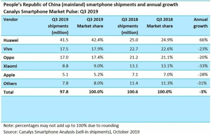แต่ถึงกระนั้นก็ไม่สามารถหยุดการเติบโตของหัวเว่ยได้, ไตรมาสที่ผ่านมา Huawei มียอดการขจำหน่ายสินค้า(เฉพาะในประเทศจีน) โตขึ้นกว่า 66% และได้ส่วนแบ่งการตลาดไปกว่า 42.4% ในไตรมาสเดียวกัน ขณะที่เจ้าอื่นๆอย่าง VIVO, Oppo และ Xiaomi ต่างร่วงกันไปเป็นแถบๆ. จากรายงานถึงตอนนี้หัวเว่ยทำยอดจำหน่ายทะลุ 200 ล้านเครื่องไปเรียบร้อยแล้ว แต่ก็ยังหายใจไม่ทั่วท้องอยู่ดีเมื่อเทียบกับปีที่แล้วที่ทำไป 206 ล้านเครื่อง. แต่ถึงกระนั้น เมื่อหักลบกับปัญหาที่เกิดกับรัฐบาลสหรัฐฯแล้วก็ถือว่าหัวเว่ยยังมีการเติบโตที่ค่อนข้างดีและต่อเนื่องอยู่.