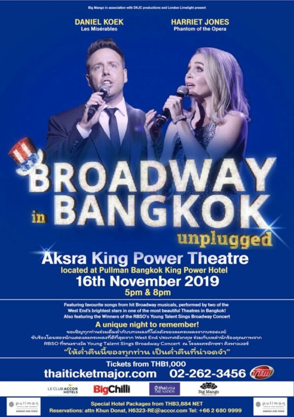 Broadway in Bangkok…unplugged 16 พฤศจิกายน เวลา 17.00 และ 20.00 ณ โรงละครอักษรา ณ คิง พาวเวอร์ คอมเพล็กซ์ สนับสนุนโดย Accor Hotels, Big Chilli และ Thaivisa.