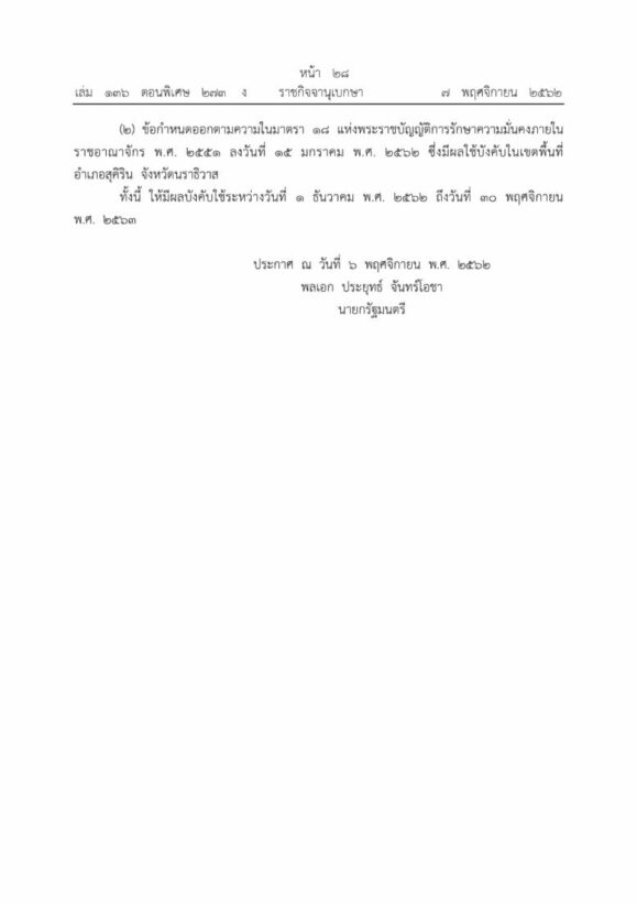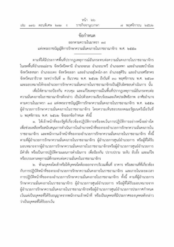 วันที่ 7 พ.ย. ราชกิจจานุเบกษา เผยแพร่ “ข้อกำหนดออกตามความในมาตรา 18 แห่งพระราชบัญญัติรักษาความมั่นคงภายในราชอาณาจักร พ.ศ.2551” มีผลบังคับใช้ ระหว่างวันที่ 1 ธันวาคม 2562