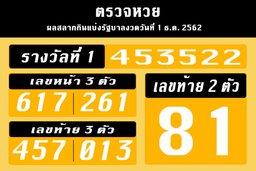ตรวจหวย ตรวจลอตเตอรี่ ตรวจผลสลากกินแบ่งรัฐบาล งวดประจำวันที่ 1 ธันวาคม 2562