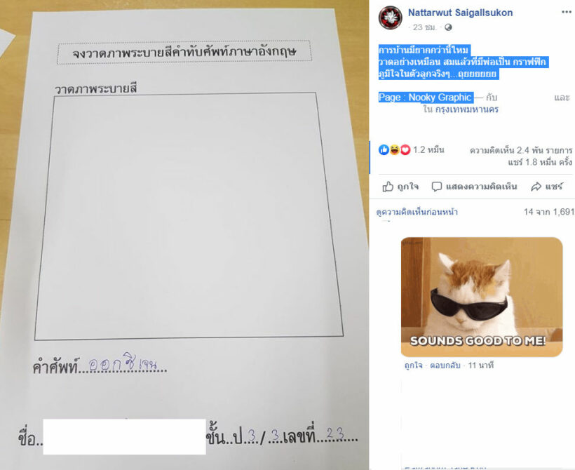 กลายเป็นโพสต์ที่เรียกกระแสฮือฮาในโลกออนไลน์ทันทีหลังคุณพ่อ ผู้ใช้เฟซบุ๊ก Nattarwut Saigallsukon ได้โพสต์ภาพการบ้านของลูกชาย ซึ่งโจทย์ระบุว่า จงวาดภาพระบายสีคำทับศัพท์ภาษาอังกฤษ พร้อมกับกรอบขนาดใหญ่ให้นักเรียนวาดระบายสี ซึ่งเมื่อเลื่อนลงมาด้านล่างทำเอาชาวเน็ตต่างขำกร๊ากในความคิดสร้างสรรค์ของลูกชาย เพราะในกระดาษไม่ได้วาดอะไรเลย เนื่องจากคำทับศัพท์ที่ลูกชายเลือกคือ “ออกซิเจน”