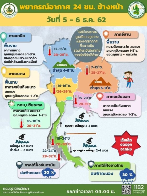 พยากรณ์อากาศ – กรมอุตุนิยมวิทยารายงานสภาพอากาศวันที่ 5-6 ธันวาคม ภาคเหนือพื้นราบ อากาศหนาว อุณหภูมิจะลดลง 1-3 องศาเซลเซียส ยอดดอยหนาว-หนาวจัดกับมีน้ำค้างแข็งบางพื้นที่ ยอดดอยอุณหภูมิต่ำสุด 4-8 องศาเซลเซียส พื้นราบอุณหูมิต่ำสุด 12-15 องศาเซลเซียส