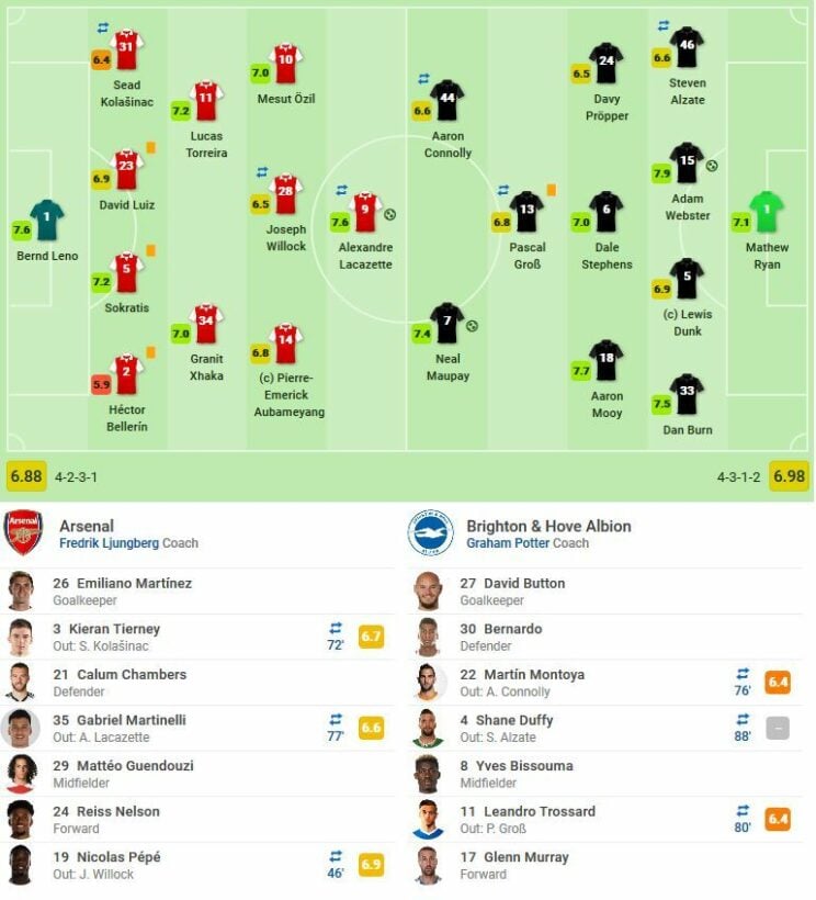 อาร์เซนอล ยังหาชัยชนะไม่เจอมา 8 นัดติดต่อกัน วันนี้ขอพลิกสถานการณ์กับ ไบรท์ตัน แถมยังได้เล่นในบ้าน ลุงเบิร์ก กุนซือชั่วคราวจัด กรานิท ชาก้า กลับมายืนคู่กับ ลูคัส ตอร์เรร่า โดยส่ง โจ วิลล็อค เป็นกองกลางตัวรุก ขนาบด้วย เมซุต โอซิล และ โอบาเมยอง ส่วนแดนหน้ายังคงใช้บริการของ อเลซองดร์ ลากาแซตต์ – หลังบ้านใช้ โซคราติส ลุยซ์ พร้อมด้วย โคลาซินัช และ เบเยริน