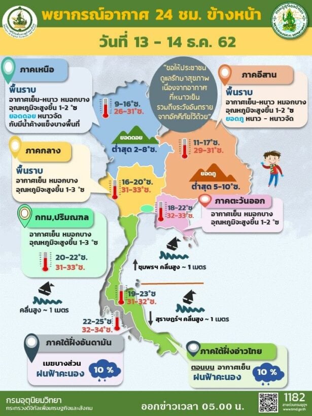 พยากรณ์อากาศ – วันที่ 13 ธ.ค. กรมอุตุนิยมวิทยา พยากรณ์อากาศ 24 ชั่วโมงข้างหน้า ภาคเหนือพื้นราบ อากาศเย็น หนาว หมอกลง อุณหภูมิสูงขึ้น 1-2 องศาเซลเซียส ยอดดอยหนาวจัดกับมีน้ำค้างแข็งบางพื้นที่ อุณหภูมิต่ำสุด 9-16 องศาเซลเซียส ยอดดอย อุณหภูมิต่ำสุด 2-8 องศาเซลเซียส