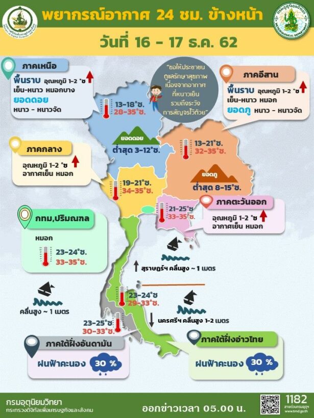 พยากรณ์อากาศ – กรมอุตุนิยมวิทยา รายงาน พยากรณ์อากาศ 24 ชั่วโมงข้างหน้า ภาคเหนือ พื้นราบอุณหภูมิ เพิ่มขึ้น 1-2 องศาเซลเซียส แต่ยังมีอากาศเย็นถึงหนาว มีหมอกบาง อุณหภูมิต่ำสุด 13-18 องศาเซลเซียส ยอดดอยหนาวถึงหนาวจัด อุณหภูมิต่ำสุด 3-12 องศาเซลเซียส