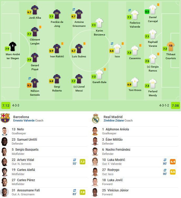 ซีเนอดีน ซีดาน มีทางเลือกไม่เยอะมาก หลังผู้เล่นประสบปัญหาบาดเจ็บกันหลายต่อหลายคน รวมไปถึง เอด็อง อาซาร์ สตาร์ชาวเบลเยี่ยม ที่พลาดโอกาสลงสนามในเกม เอลกลาซิโก้ นัดแรกในอาชีพการค้าแข้งไปอย่างน่าเสียดาย ในขณะที่ อาซูลกราน่า ส่งสามประสานสุดโหด ซัวเรซ-กรีซมันน์-เมสซี่