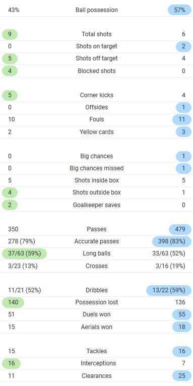 ครึ่งเวลาแรกทั้งคู่เล่นกันได้จืดชืดสุดๆ ไม่มีใครหาจังหวะยิงตรงกรอบได้เลยแม้แต่ครั้งเดียว รูปเกมวนไปวนมาอยู่กับการยื้อแย่งบอล ขาดจินตนาการใดๆ ทั้งสิ้น และจบ 45 นาทีด้วยสกอร์ดังกล่าว