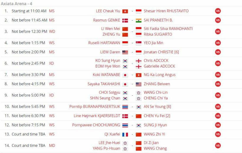 | 17.30 | 2 | MS | กัน กันตภณ หวังเจริญ | Sameer VERMA (IND) | 1-2 |