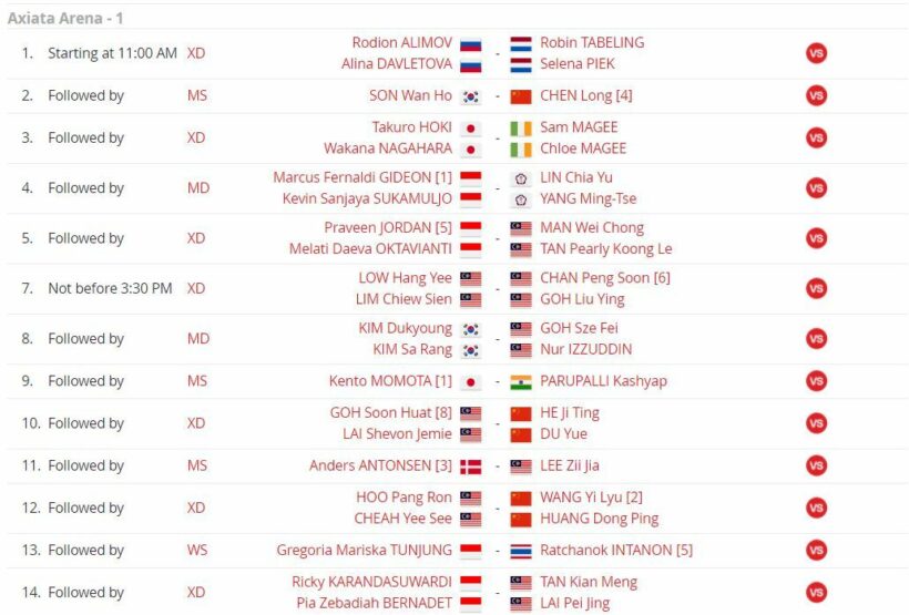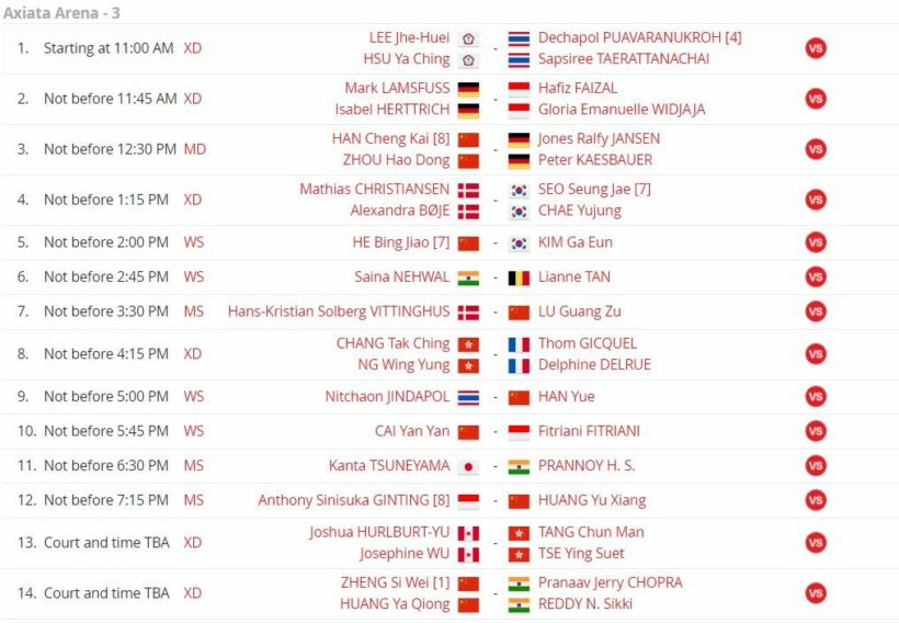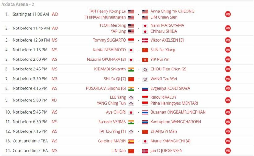 | 17.30 | 2 | MS | กัน กันตภณ หวังเจริญ | Sameer VERMA (IND) | 1-2 |