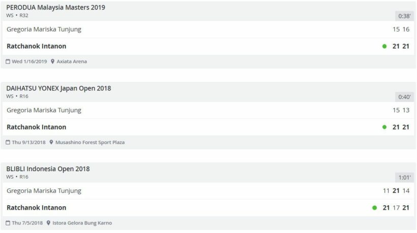 ผลปรากฏว่า การพบกัน 6 ครั้งหลังสุดของ น้องเมย์ รัชนก กับ Gregoria Mariska Tunjung เป็นทางด้าน น้องเมย์ มือวางอันดับ 5 ของโลก ที่เอาชนะไปได้ทั้งหมด 6 ครั้งจากการพบกัน