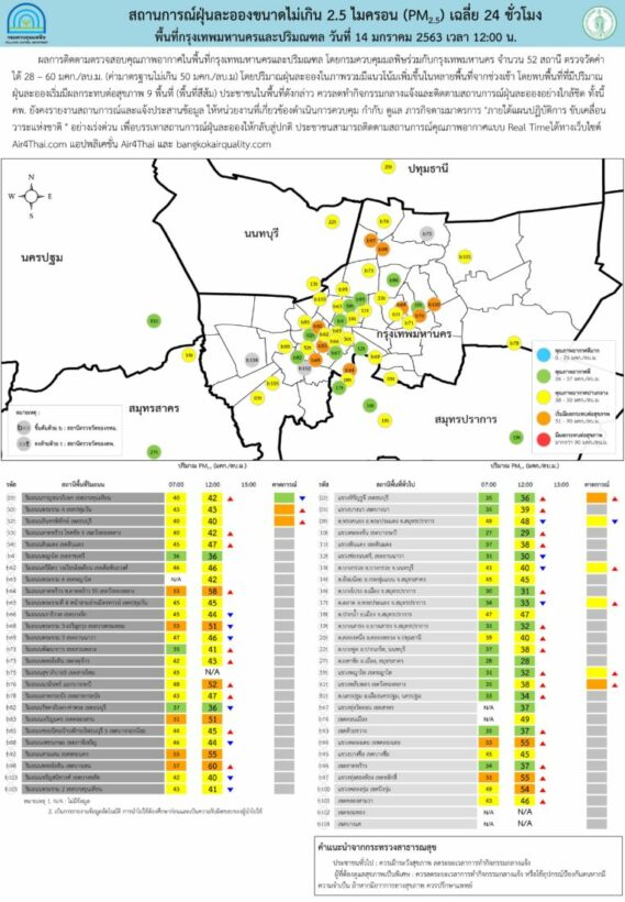 ผลการติดตามตรวจสอบคุณภาพอากาศในพื้นที่กรุงเทพมหานครและปริมณฑล โดยกรมควบคุมมลพิษร่วมกับกรุงเทพมหานคร จำนวน 52 สถานี ตรวจวัดค่าได้ 28-60 มคก/ลบ.ม. (ค่ามาตรฐานไม่เกิน 50 มคก/ลบ.ม.) โดยปริมาณฝุ่นละอองในภาพรวมมีแนวโน้มมากขึ้นหลายพื้นที่จากช่วงเช้า โดยพบพื้นที่ที่มีค่าฝุ่นละออง เริ่มมีผลกระทบต่อสุขภาพ 9พื้นที่ (พื้นที่สีส้ม) ประชาชนในพื้นที่ดังกล่าวควรงดกิจกรรมกลางแจ้งและติดตามสถานการณ์ฝุ่นละอองอย่างใกล้ชิด ทั้งนี้ คพ.ยังคงรายงานสถานการณ์และแจ้งประสานข้อมูล ให้หน่วยงานที่เกี่ยวข้องควบคุม กำกับ ดูแล ภารกิจตามมาตรการ “ภายใต้แผนปฏิบัติการขับเคลื่อนวาระแห่งชาติ” อย่างเร่งด่วน เพื่อบรรเทาสถานการณ์ฝุ่นละอองให้กลับมาสู่ปกติ ประชาชนสามารถติดตาม สถานการณ์คุณภาพอากาศ แบบReal Time ได้ทางเว็บไซต์ www.Air4thai.com แอปพลิเคชั่น Air4thai และ www.bangkokairquality.com