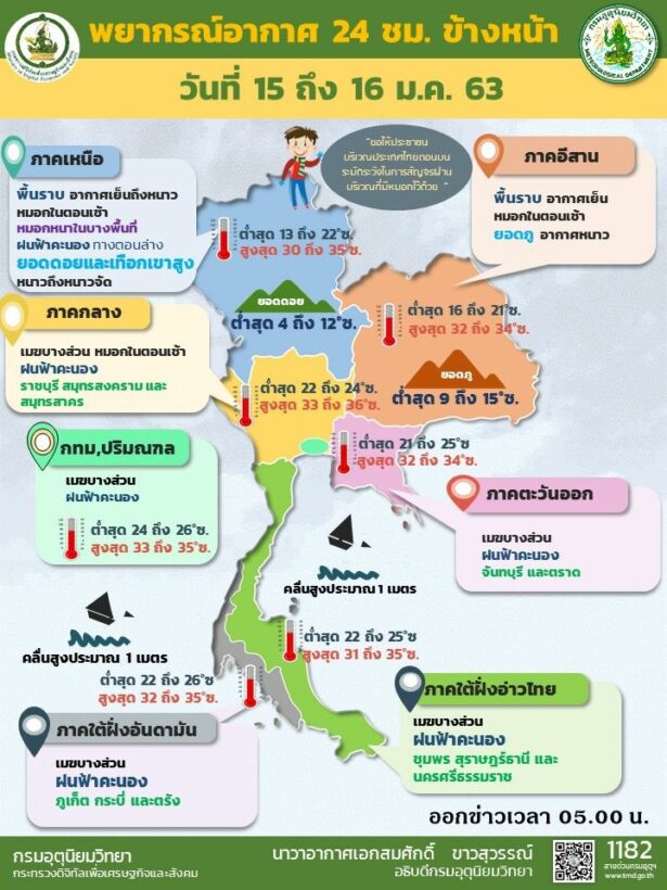 กรมอุตุนิยมวิทยา ได้พยากรณ์อากาศ ประจำวันที่ 15 มกราคม 2563