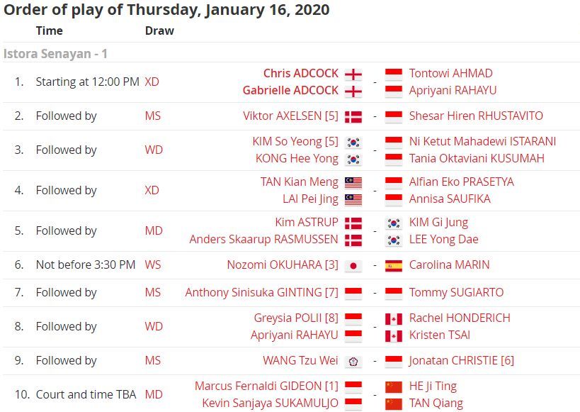โปรแกรมการแข่งขันแบดมินตัน Indonesia Masters 2020 ซึ่งเป็นการแข่งขันระดับ HSBC BWF World Tour Super 500 ชิงเงินรางวัล 400,000 เหรียญสหรัฐ ณ กรุงกัวลาลัมเปอร์ ประเทศมาเลเซีย ประจำวันพฤหัสบดีที่ 16 มกราคม 2563