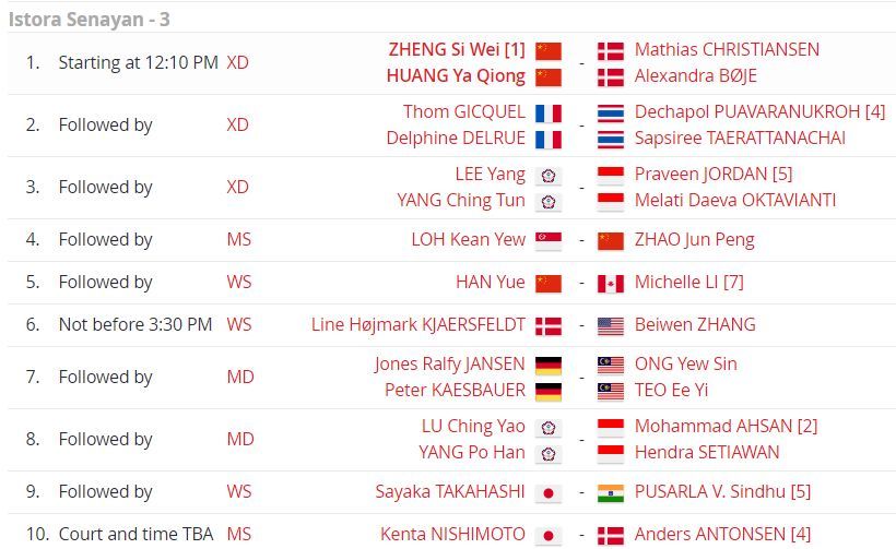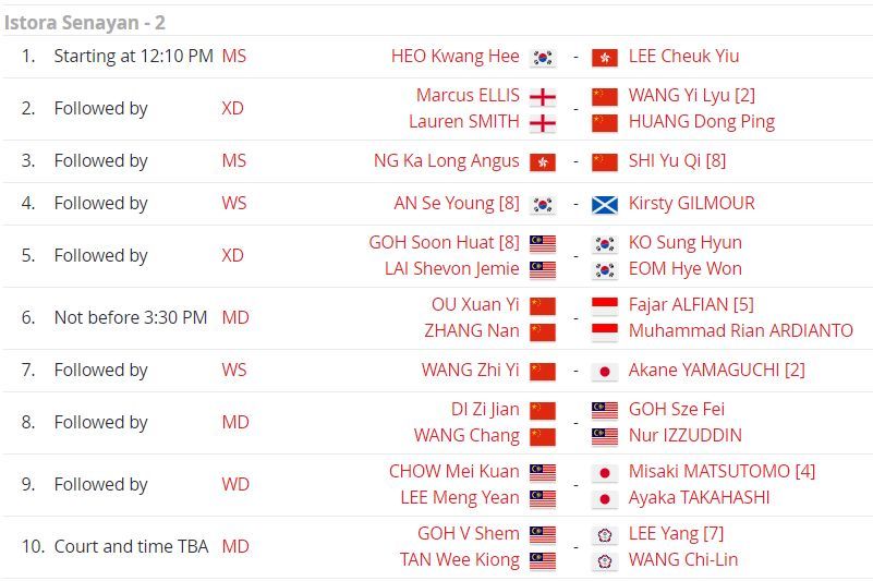 | เวลา | ประเภท | รายชื่อนักแบดไทย | รายชื่อคู่แข่ง |