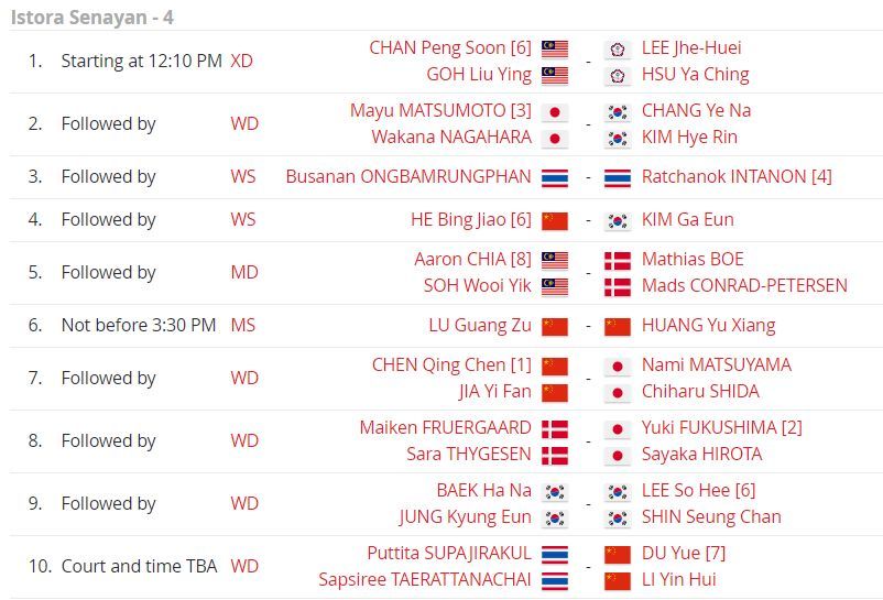 | 13.45 | หญิงเดี่ยว (WS) | รัชนก อินทนนท์[4] | บุศนันทน์ อึ๊งบำรุงพันธุ์ |