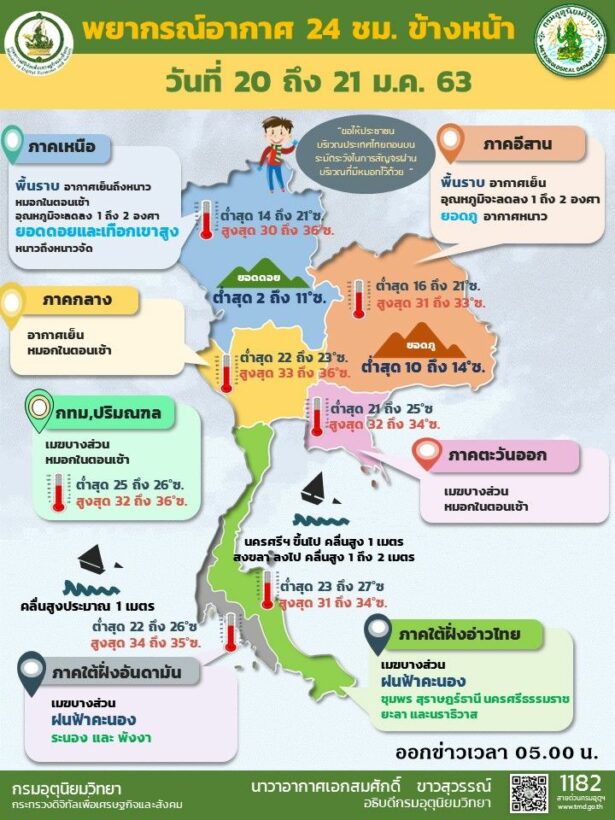 กรมอุตุนิยมวิทยา พยากรณ์อากาศ ประจำวันที่ 20 มกราคม 2563