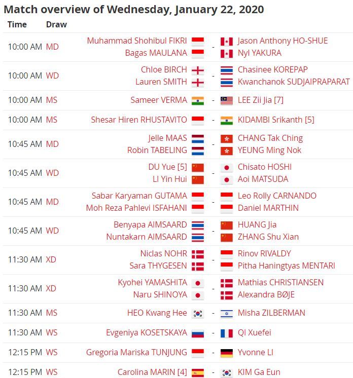22 ม.ค. โปรแกรมแบดมินตัน รอบแรก Princess Sirivannavari Thailand Masters 2020 ปริ้นเซส สิริวัณณวรี ไทยแลนด์ มาสเตอร์ส พรีเซนเต็ด บาย โตโยต้า ทัวร์นาเมนต์ระดับบีดับเบิลยูเอฟ เวิลด์ ทัวร์ 300