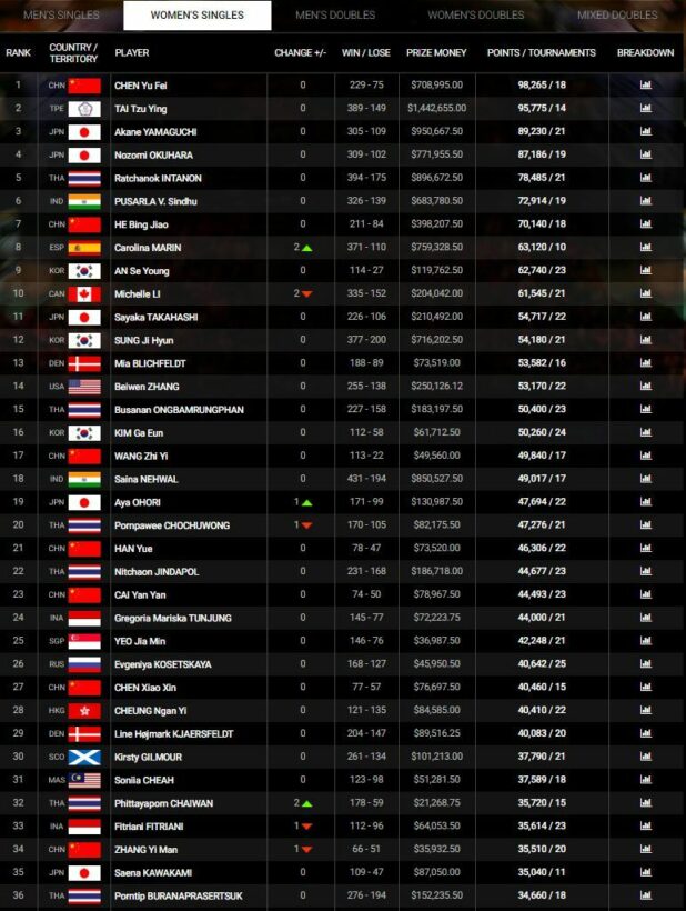 ประเภทหญิงเดี่ยว – ใน 10 อันดับแรกที่มีการเปลี่ยนแปลงมีคนเดียวคือ Carolina MARIN ที่ขยับ 2 อันดับมาอยู่ที่อันดับ 8 โดยมือ 1-7 ยังคงเป็นนักกีฬาเดิมคือ CHEN Yu Fei ตามมาด้วย TAI Tzu Ying, Akane YAMAGUCHI ทีได้แชมป์ในไทย Nozomi OKUHARA และ เมย์ รัชนก อินทนนท์ อยู่อันดับ 5