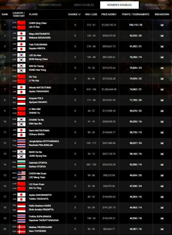 ประเภทหญิงคู่ – เป็นประเภทที่ไม่มีการเปลี่ยนแปลงอันดับเลย โดย CHEN Qing Chen / JIA Yi Fan ที่ได้แชมป์ในไทย ยังคงรักษาอันดับหนึ่ง ต่อด้วย Mayu MATSUMOTO / Wakana NAGAHARA และ Yuki FUKUSHIMA / Sayaka HIROTA จากญี่ปุ่น