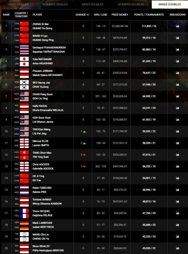 ส่วนประเภทคู่ผสม ก็ไม่เปลี่ยนแปลงในท็อปเทน โดย บาส-ปอป้อ เดชาพล พัววรานุเคราะห์/ทรัพย์สิรี แต้รัตนชัย ยังรักษาอันดับ 3 ต่อจาก ZHENG Si Wei / HUANG Ya Qiong และ WANG Yi Lyu / HUANG Dong Ping สองคู่มือดีของจีน