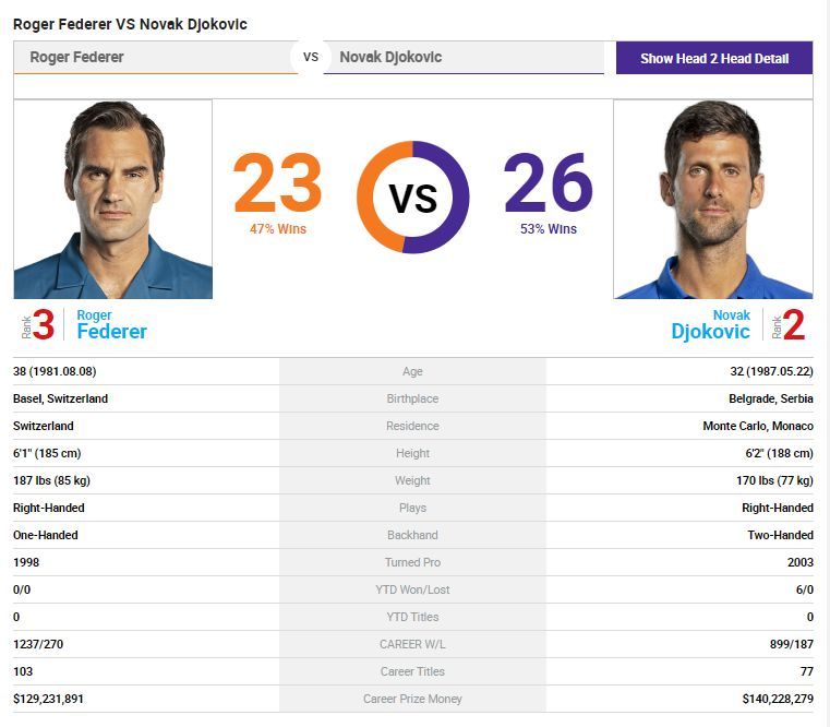 H2H สถิติการพบกับของ Roger Federer VS Novak Djokovic