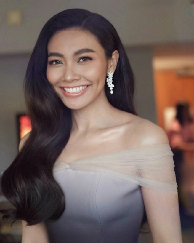 ส่วนชุดที่ใช้ขึ้นแสดงนั้นก็เป็นแบรนด์ไทยอย่าง Unkuniya ชุดเดรสยาว เปิดแขนซ้าย มีการเย็บปักอย่างประณีต