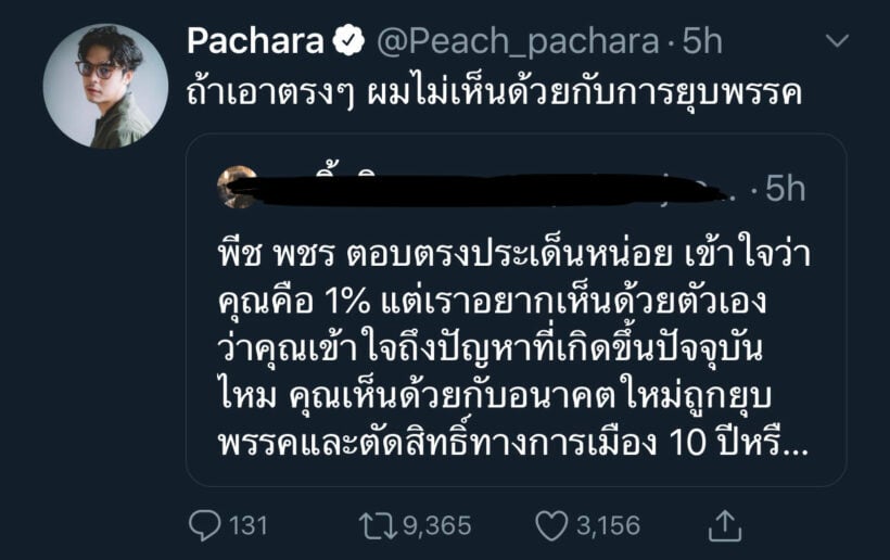 พีช พชร ตอบตรงประเด็นหน่อย เข้าใจว่าคุณคือ 1% แต่เราอยากเห็นด้วยตัวเอง ว่าคุณเข้าใจถึงปัญหาที่เกิดขึ้นปัจจุบันไหม คุณเห็นด้วยกับอนาคตใหม่ถูกยุบพรรคและตัดสิทธิ์ทางการเมือง 10 ปีหรือเปล่า