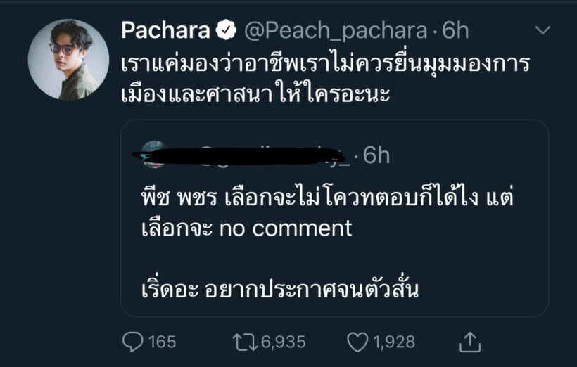พีช พชร โนคอมเมนต์การเมือง โดนขุดทวิตในอดีต