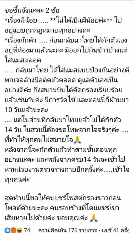 ล่าสุด เจ้าของเฟซออกมาชี้แจงแล้วว่าตนไม่ใช่ผีน้อย ไปอย่างถูกกฎหมาย ขอโทษที่กลับไทยแล้วไม่ได้กักตัว 14 วัน