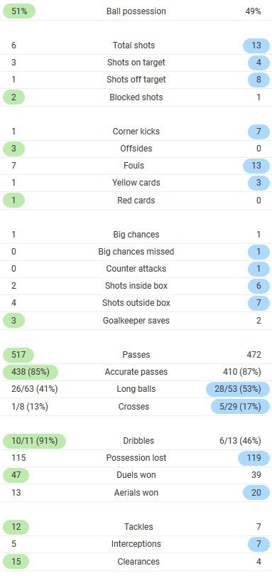 RED CARD! นาทีที่ 28 จากจังหวะปล่อยเป็นลูกได้เปรียบของผู้ตัดสิน ราอูล ฆิเมเนซ แทงให้ ดิโอโก้ โชต้า หลุดไปเดี่ยวๆ กำลังจะเข้ากรอบเขตโทษอยู่แล้ว ทว่า เซเมโด้ เซ็นเตอร์แบ็คของเจ้าถิ่น ตัดสินใจแหย่ขาสกัดเบาๆ ทำให้ โชต้า ล้มลงไปกองกับพื้น ผู้ตัดสินไม่รอช้าวิ่งมาแจกใบแดงทันที