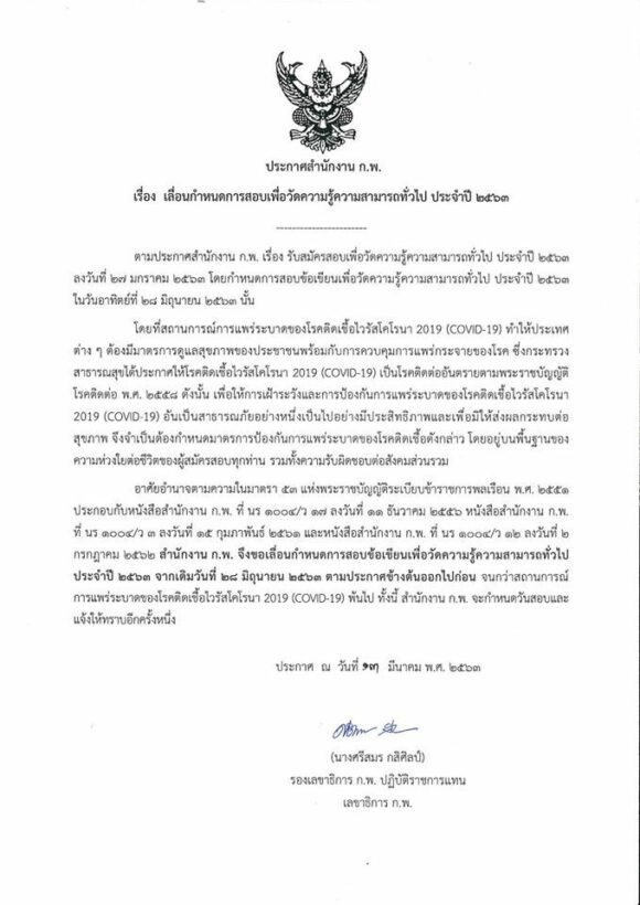 ด่วน ประกาศเลื่อนสอบก.พ. จนกว่า COVID-19 คลี่คลาย