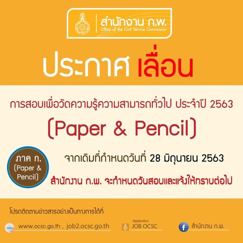 สำนักงาน ก.พ. โพสต์ผ่านเฟซบุ๊ก ประกาศเลื่อนการสอบเพื่อวัดความรู้ความสามารถทั่วไป ประจำปีงบประมาณ พ.ศ. 2563 (Paper & Pencil) จากเดิมกำหนดวันที่ 28 มิถุนายน 2563 ออกไปก่อน สำนักงาน ก.พ. จะกำหนดวันสอบและแจ้งให้ทราบต่อไป
