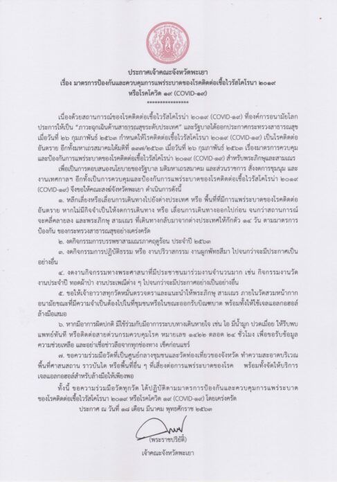 ประกาศเจ้าคณะจังหวัดพะเยา เรื่อง มาตรการป้องกันและควบคุมการแพร่ระบาดของโรคติดต่อเชื้อไวรัสโคโรนา 2019 / โควิด-19 ด้วยองค์การอนามัยโลกประกาศให้เป็น “ภาวะฉุกเฉินด้านสาธารณสุขระดับประเทศ และรัฐบาลได้ออกประกาศกระทรวงสาธารณสุข กำหนดให้เชิ้อไวรัสโควิด-19 เป็นโรคติดต่ออันตราย เพื่อตอบสนองนโยบายของรัฐบาล มติมหาเถรสมาคม และส่วนราชการสั่งงดการชุมนุมและงานเทศกาล อีกทั้งเพื่อควบคุมการแพร่ระบาดของโรคโควิด-19 จึงได้ขอให้คณะสงฆ์พะเยา ดำเนินการดังนี้
