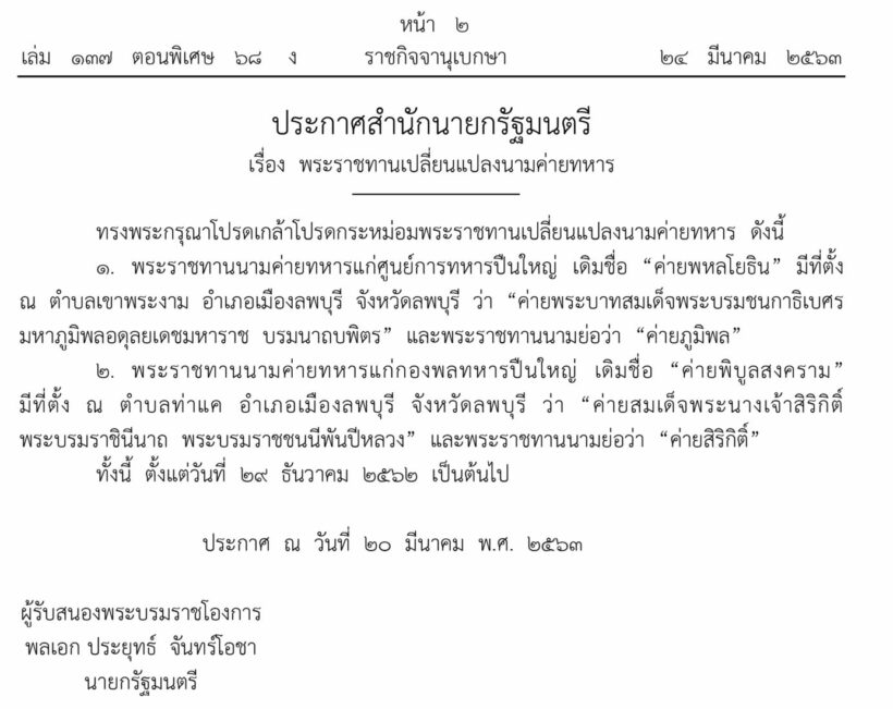 โปรดเกล้าฯ พระราชทานเปลี่ยนแปลงนามค่ายทหาร