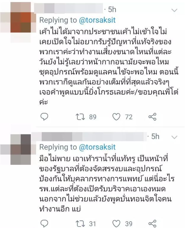ล่าสุด โต๋ ศักดิ์สิทธิ์ เวชสุภาพร นักร้องนักดนตรีชื่อดัง ได้ทวีตข้อความแสดงความคิดเห็นถึงเรื่องนี้ผ่านทางทวิตเตอร์ส่วนตัวว่า “ฟังสัมภาษณ์ของท่าน รมต. แล้วน้ำตาไหลเลยครับ เปล่าซึ้งท่านนะ แต่สงสารและเคารพหัวใจของคุณหมอ/บุคลากรแพทย์ที่เอาตัวไปเสี่ยงอยู่ศึกแถวหน้าเพื่อดูแล ปชช. ถ้าท่านเองก็ยังไม่สามารถ support เค้าได้ดีเท่าที่ควร ก็พูดให้กำลังใจกันก็ได้นิครับ ไม่ใช่ไป blame พวกเค้า #โควิด19”