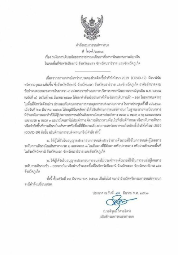 เนื่องจากสถานการณ์วิกฤตกระแพร่ระบาดของเชื้อไวรัส COVID-19 เมื่อวันที่ 30 มีนาคม ที่ผ่านมา กรมการขนส่งทางบก ออกหนังสือคำสั่ง เรื่อง ระงับการเดินรถโดยยสารสาธารณะเป็นการชั่วคราวในสถานการณ์ฉุกเฉินในเขตุพื้นที่จังหวัดปัตตานี จังหวัดยะลา จังหวัดนราธิวาส และจังหวัดภูเก็ต โดยมีเนื้อหาระบุ ดังนี้.