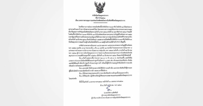 ชาติชาย อุทัยพันธ์ ผู้ว่าราชการจังหวัดสมุทรปราการ ผู้กำกับการบริหารราชการในสถานการณ์ฉุกเฉิน จังหวัดสมุทรปราการ ลงนามในประกาศ เรื่อง มาตรการควบคุมการแพร่ของโรคติดต่ออันตรายในท้องที่จังหวัดสมุทรปราการ โดยสืบเนื่องจากการระบาดของโรคโควิด-19 ระบุว่า