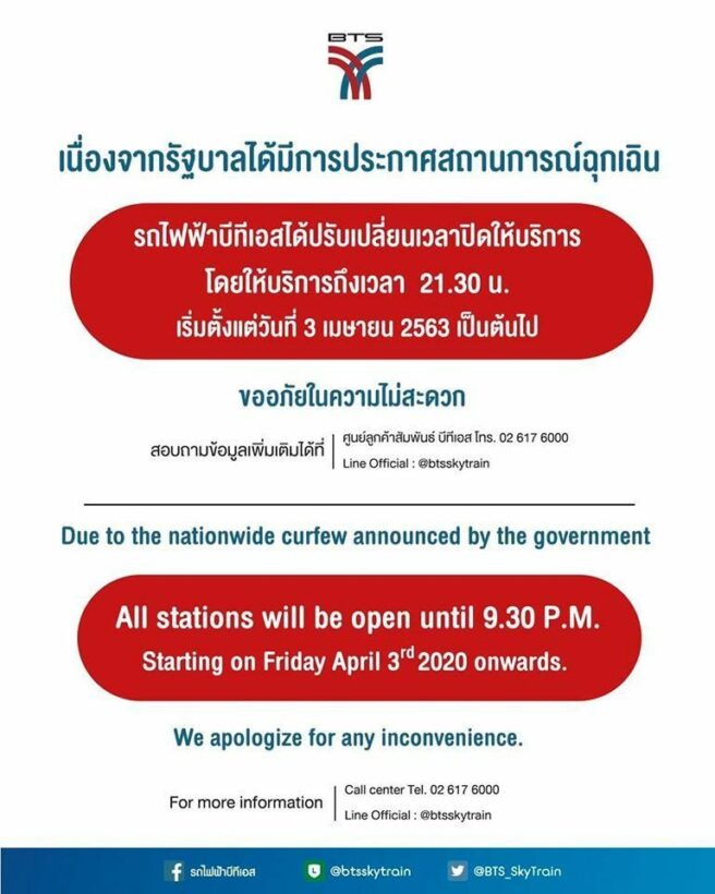 นายสุรพงษ์ เลาหะอัญญา กรรมการผู้อำนวยการใหญ่ บริษัท ระบบขนส่งมวลชนกรุงเทพ จำกัด (มหาชน) หรือผู้ให้บริการ รถไฟฟ้าบีทีเอส แจ้งว่า ตามประกาศสถานการณ์ฉุกเฉินในทุกเขตท้องที่ทั่วราชอาณาจักร พ.ร.ก. การบริหารราชการในสถานการณ์ฉุกเฉิน (ฉบับที่ 2) บริษัทฯ ขอปรับเวลาการให้บริการรถไฟฟ้าบีทีเอสเพื่อปฏิบัติตามคำประกาศจากทางรัฐบาล ดังนี้