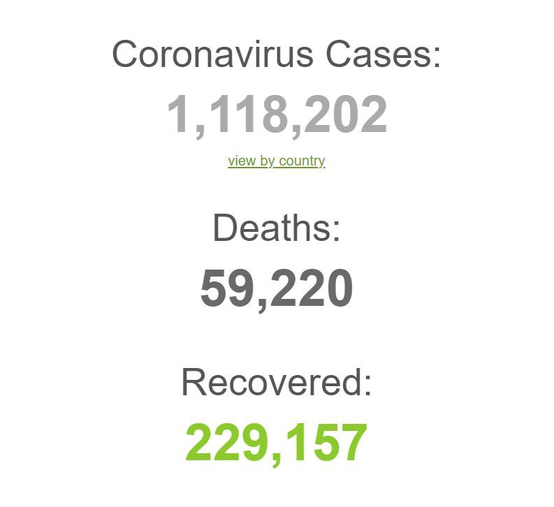 ขณะที่จำนวนผู้ติดเชื้อที่ได้รับการยืนยันแล้วทั่วโลกอยู่ที่ 1,097,909 คนโดยสหรัฐยังคงมีผู้ติดเชื้อมากที่สุดที่ 276,995 อิตาลี 119,827 สเปน 119,199 เยอรมนี 91,159 จีน 82,511 ฝรั่งเศส 65,202 อิหร่าน 53,183 อังกฤษ 38,690 ตุรกี 20,921 สวิตเซอร์แลนด์ 19,606 เบลเยียม 16,770 เนเธอร์แลนด์ 15,821 แคนาดา 12,439 ออสเตรีย 11,524 และเกาหลีใต้ 10,062
