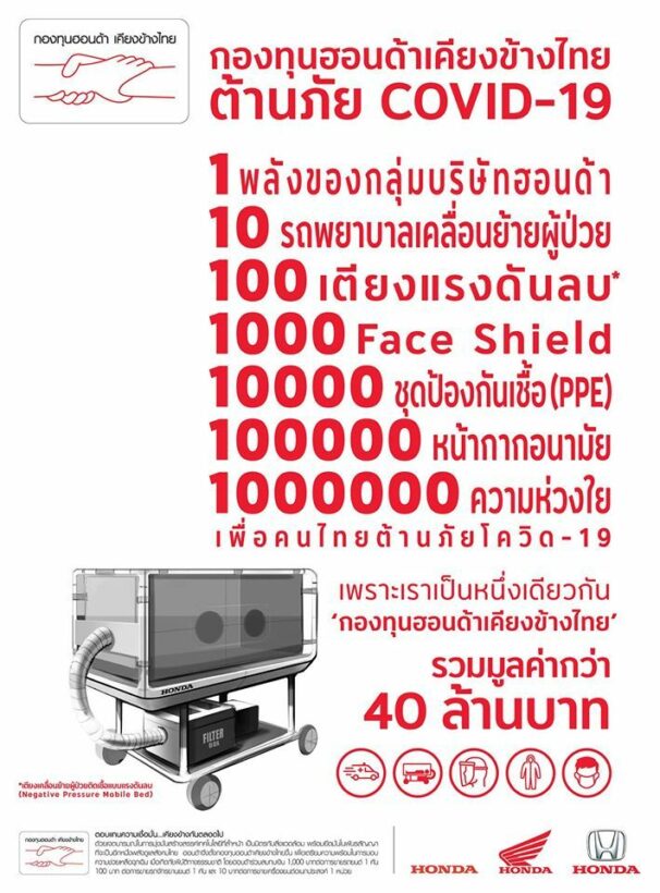 - เตียงเคลื่อนย้ายผู้ป่วยติดเชื้อแบบแรงดันลบ (Negative Pressure Mobile Bed) 100 เตียง ซึ่งคุณสมบัติของเตียงนี้จะสามารถช่วยป้องกันการแพร่กระจายของเชื้อโควิด-19 และเพิ่มความปลอดภัยให้แก่บุคลากรทางการแพทย์ที่ต้องดูแลผู้ป่วยกลุ่มเสี่ยง ด้วยการควบคุมแรงดันอากาศให้เป็นลบ (Negative Pressure) ทำการดูดอากาศบริเวณที่นอนของผู้ป่วยผ่านการกรองเชื้อโรคระดับ HEPA Filter (High-efficiency Particulate Air Filter) แล้วปล่อยอากาศออกสู่ภายนอก โดยมีพนักงานสายการผลิตรถยนต์ บริษัท ฮอนด้า ออโตโมบิล (ประเทศไทย) จำกัด เป็นทีมผลิต