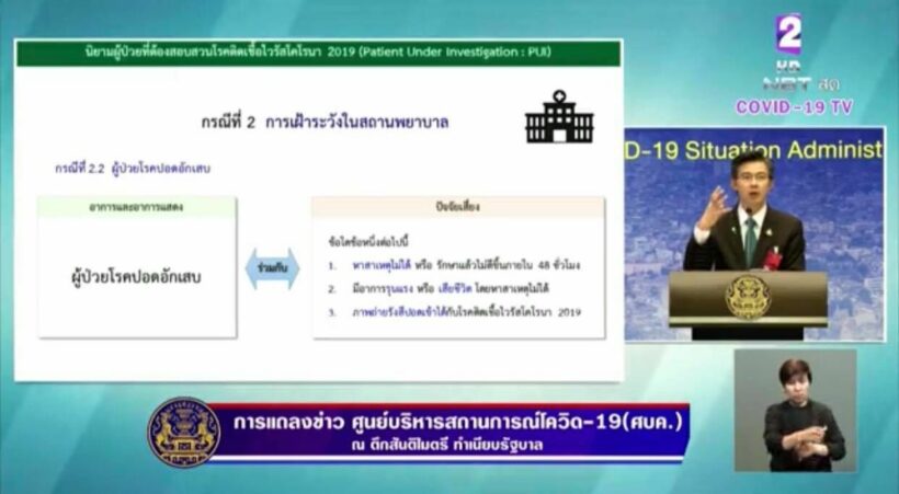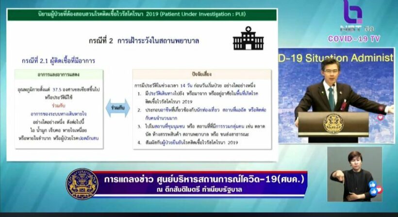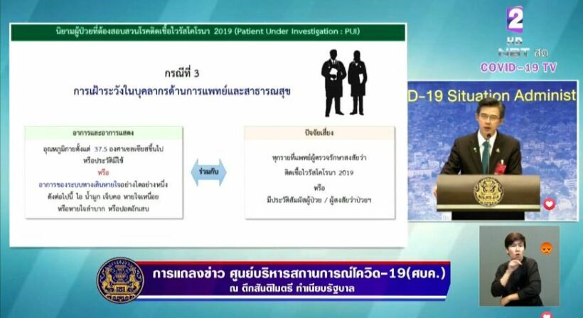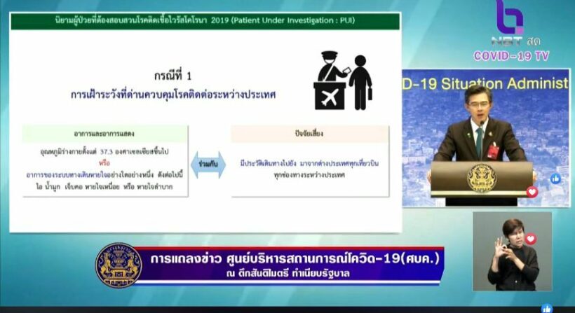 อุณหภูมิกายตั้งแต่ 37.5 องศาเซลเซียสขึ้นไปหรือมีประวัติไข้ หรือ อาการของระบบทางเดินหายใจอย่างใดอย่างหนึ่ง ดังต่อไปนี้ ไอ น้ำมูก เจ็บคอ หายใจเหนื่อย หรือหายใจลำบาก หรือปอดอักเสบ