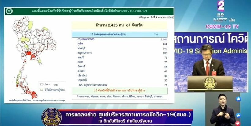 โควิด-19 9 เมษายน – นพ.ทวีศิลป์ วิษณุโยธิน โฆษก ศบค. รายงานสถานการณ์ผู้ป่วยโควิด-19 ประจำวัน พบผู้ป่วยรายใหม่จำนวน 54 ราย มีผู้ติดเชื้อสะสม 2,423 หายป่วยแล้ว 940 ราย เสียชีวิตสะสม 32 ราย (เสียชีวิตเพิ่ม 2 ราย)