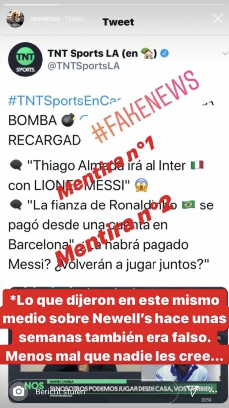 เพราะว่า เมสซี่่ ได้ออกมาโพสต์ข้อความลงในไอจีสตอรี่ส่วนตัว พร้อมกับชี้แจงว่า “ที่เกิดขึ้นทั้งหมด เป็นข่าวปลอมทั้งนั้น ไม่ว่าจะเป็นข่าว เมสซี่่ ไป อินเตอร์ มิลาน และ เมสซี่่ ให้เงิน โรนัลดินโญ่ เรื่องติดคุก”
