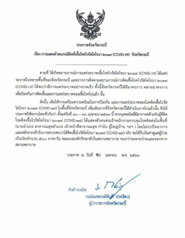 ประกาศ ณ วันที่ 10 เมษายน พ.ศ. ๒๕๖๓ ลงชื่อ พ.ต.ท.ม.ล.กิติบดี ประวิตร ผู้ว่าราชการจังหวัดกระบี่
