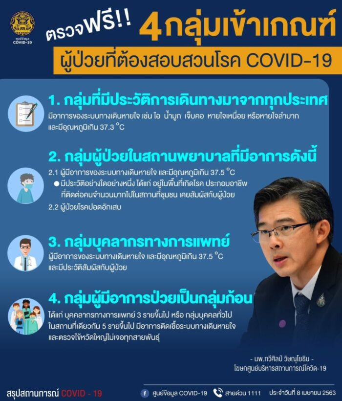 นายแพทย์สมศักดิ์ อรรฆศิลป์ อธิบดีกรมการแพทย์ อธิบายเกี่ยวกับแนวทางการรักษาใหม่ว่า การรักษาคนติด ไวรัสโคโรนา จะแบ่งกลุ่มตามอาการเป็น 4 กรณี คือ
