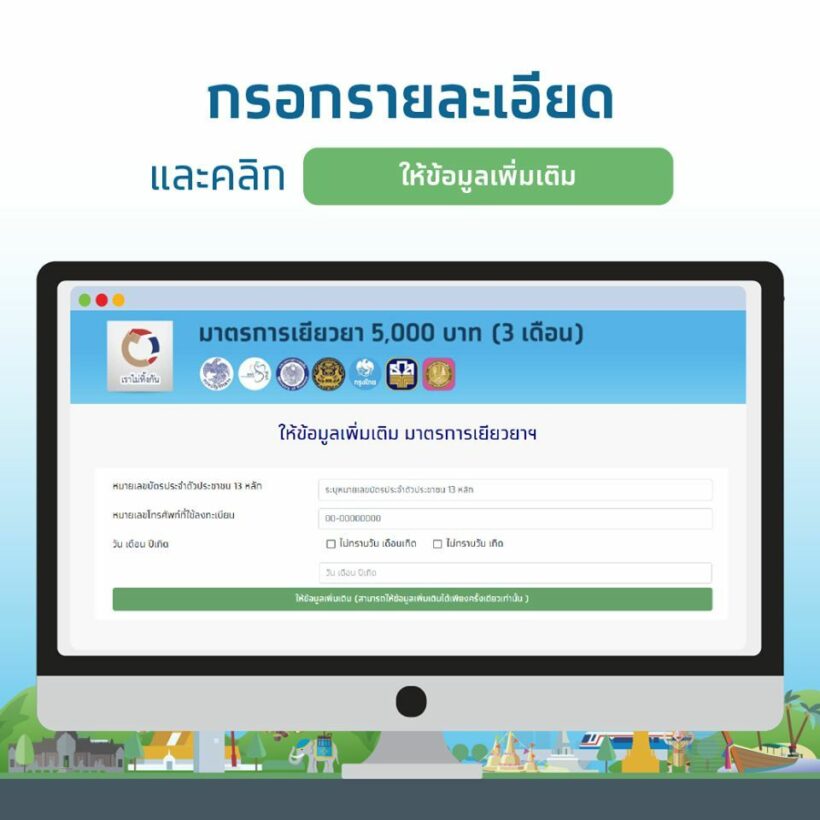 ส่งข้อมูลเพิ่มเติมเราไม่ทิ้งกัน – จากกรณีผู้ได้รับผลกระทบจากโควิด-19 ที่ไม่ได้อยู่ในระบบประกันสังคม รัฐเปิดให้ลงทะเบียนผ่านเว็บไซต์ www.เราไม่ทิ้งกัน.com โดยวันที่ 13-14 เมษายนนี้ คลังจะทะยอยโอนเงิน 5,000 บาทให้กับผู้ได้รับสิทธิ์อีก วันละ 300,000 คน